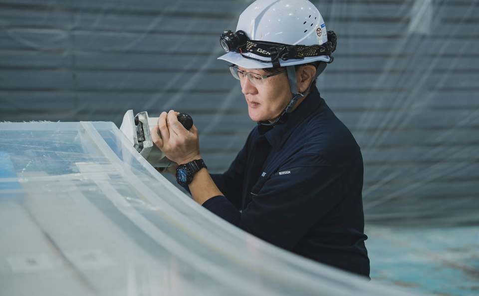 Q2 - IMPRESSIVE WORK2012年にチャイムロング横琴海洋王国(中国)のドーム型の水槽用パネルを製造したことが印象に残っています。直径12mと巨大なため、港から直接船に積載できるように神戸のポートアイランドに臨時の作業場を作りました。港の一角をコンテナで囲い、テントを張った作業場は電気も通っていません。そのため発電機を用いてアクリルパネルを高温に加熱して成形や加工を行いました。耐火服や耐熱服を身につけ灼熱の中での作業は大変でしたが、当時の会長(初代社長・敷山哲洋)の陣頭指揮のもと、加工と鉄鋼の精鋭が集まって取り組んだ一大プロジェクトで、思い出に残っています。